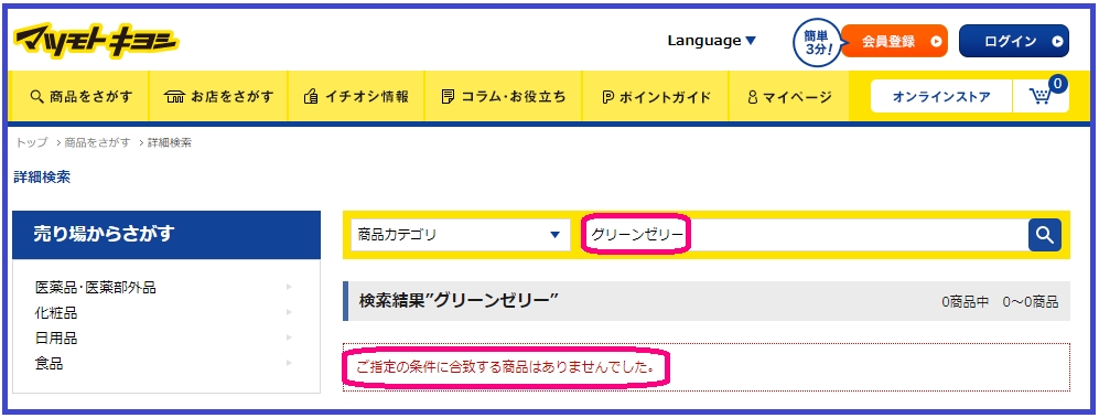 全国に700店舗以上展開している大手ドラッグストア「マツキヨ」でグリーンゼリーが売られていないか調べてみました。